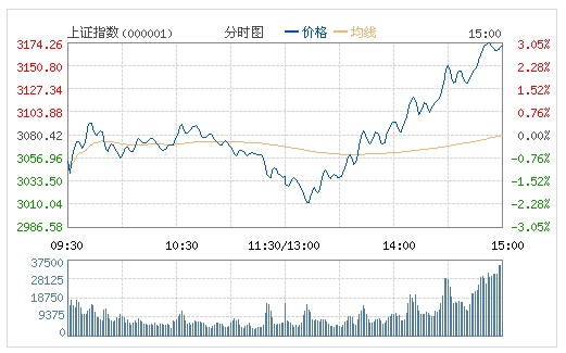 內地股市今日一度跌逾2%,午后銀行股、上海本地股拉升護盤,推動各板塊上揚,股指一度漲逾3%上演大反轉。截至收盤,滬指漲2.92%,報3170.45點。
