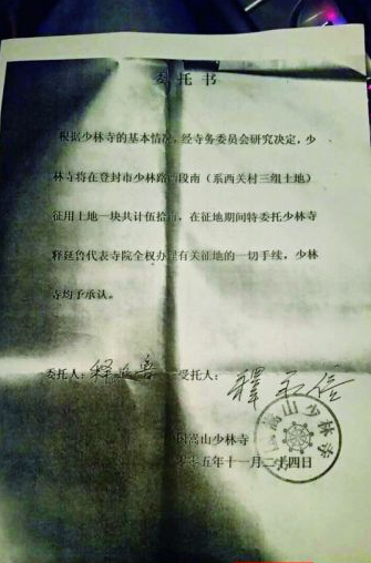 據一份網絡爆料稱,少林寺武僧團培訓基地名義上是釋延魯開辦的,實際是少林寺投資了1700萬元,委托釋延魯開辦。網帖還出示了一份當年少林寺給釋延魯的委托書,上面寫著:根據少林寺的基本情況,經寺務委員會決定,少林寺將在登封市少林路西段南(系西關村三組土地)征用土地一塊共計50畝,在征地期間特委托少林寺釋延魯代表寺院全權辦理有關征地的一切手續,少林寺均予承認。落款時間是2005年11月24日,并有釋永信簽名并加蓋了少林寺的公章。委托書上所指的這一地塊正是少林寺武僧團培訓基地的所在地,只不過現在的占地面積已經發展到1500百畝。從委托書上判斷,當年釋延魯應該是拿著委托書,以少林寺的名義去辦理的批地手續。但委托書并不能證明,這所學校就是少林寺委托釋延魯所開。