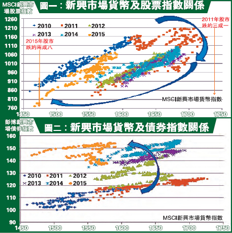 影響一定有,問題只是有多嚴重及維持多久。首先,今次新興市場所面臨的問題,是否有如1997及2007年的金融危機般嚴重,現在或者仍難解答,但有一樣明顯分別就是洗倉的時間性。以2007年為例,無論股市、匯市及債市,基本上三大市場都在2007至2008年見頂后轉向,前后相距約一年左右。再看圖一,圖中見到新興貨幣在2011年見頂,股市亦然,現時亦更已跌穿2010年低位,危機似乎已悄悄來到。