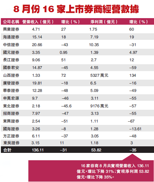 根據9月8日公布的16家上市券商8月份月報來看,8月份盈利增速環比繼續下滑。16家券商8月共實現營業收入136.11億元,環比下降31%,實現凈利潤53.82億元,環比下降35%。值得注意的是,8月凈利潤環比7月有6家券商有不同幅度增長。其中,漲幅較大的3家券商是山西證券、興業證券和海通證券,環比7月分別增長134%、60%和19%。