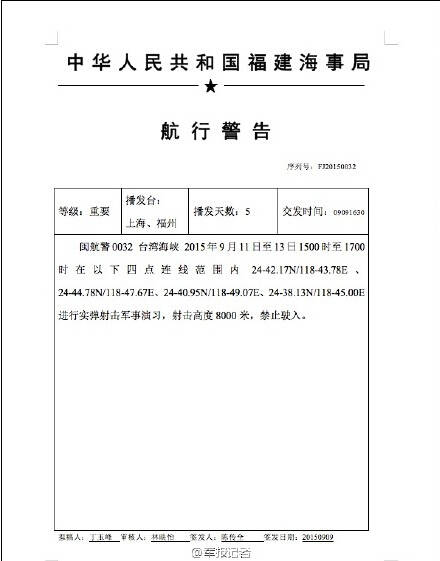 解放軍報9月10日消息據中國海事局網站消息,解放軍9月11日至13日15時至17時在臺灣海峽以下四點連線范圍內24-42.17N/118-43.78E、24-44.78N/118-47.67E、24-40.95N/118-49.07E、24-38.13N/118-45.00E進行實彈射擊軍事演習,射擊高度8000米,禁止駛入。