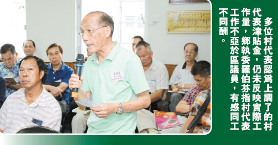 另外,去年鄉議局落鄉探訪時,屯門鄉委會村代表曾指政府發放村代表津貼每季2000元,連洗碗工也不如,本刊曾專題報道反映村民意見。今年6月14日民政總署根據甲類消費物價指數累計的21%,財經事務及庫務局局長批准上調村代表金至每季2420元,由今年4月1日起生效。但今次鄉議局落鄉探訪粉嶺鄉委會時,該鄉多位村代表再表示不滿。該鄉執委羅伯芬表示,政府雖將村代表津貼上調,但仍然有失尊嚴,村代表工作不亞於區議員,同工不同酬,希望鄉議局繼續為村代表爭取津貼。