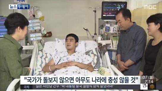 韓國總統樸槿惠6日探望了在“地雷事件”中受重傷的兩名韓國士兵。(韓國MBC電視臺截圖)