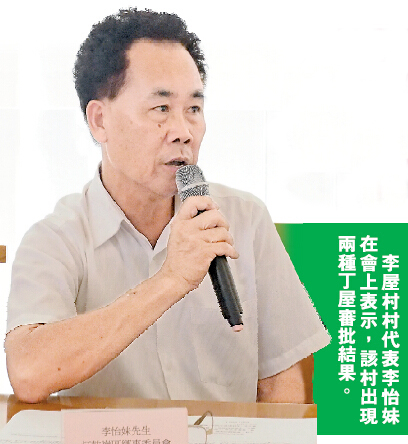 打鼓嶺鄉委會李屋村村代表李怡妹在會上表示,村民反映在同一條村中的村東、村西申請丁屋時有不同結果,村東村民在4、5年間獲地政處在V-Zone(鄉村發展)用地批建12間丁屋,而村西村民在4、5年間申請10間丁屋,但至今沒有一間丁屋獲批建。村西的村民反映,由於是在VE地段(村界)上建丁屋而不獲規劃署批建,規劃署在回覆不獲批建丁屋理據是在用盡V-Zone之後方動用VE地段,另一項理據是遵循環境團體意見,因其地段為優質耕地,所以不獲批建丁屋,故形成同一條村存在兩種不同丁屋審批結果。