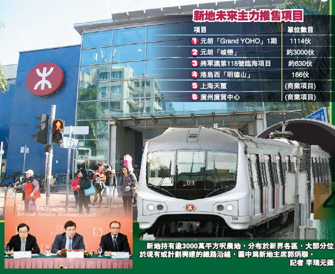 此外,據了解,截至今年6月底止,集團在港共擁有5080平方尺的土地儲備,當中以地盤面積計算,現持有的新界區農地面積就超過3000萬平方尺,其中大部分均分布於鐵路沿線地段,反映集團要興建「獨立的鐵路王國」可謂彈藥充足,加上集團執行董事兼首席財務總監陳國威昨日指出,未來兩至三年,集團每年在港的物業落成量將超過300萬平方尺,屬近年的高峰,同時更揚言,未來會繼續積極物色購地機會,不禁令人對於集團下一步棋更為期待。