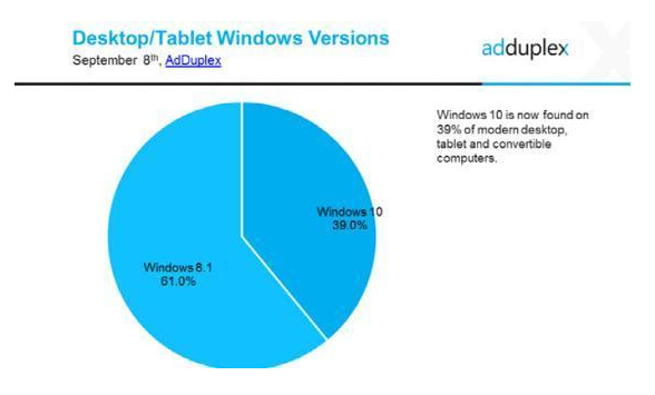 根據AdDuplex今天發布的最新統計數據顯示,Windows 10正在迅速蠶食Windows 8.1的市場份額。調查表明,當合并Windows 10和Windows 8.1 PC和平板的安裝數據,Windows 10已占這些設備的39%,而Windows 8.1為61%。