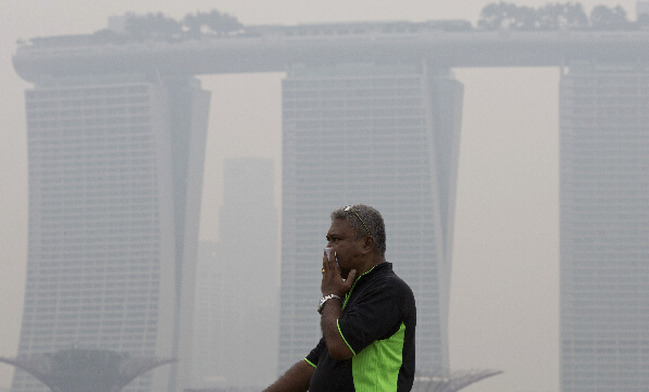 9月10日,一名男子在被烟霾笼罩的新加坡街头捂住鼻子行走。