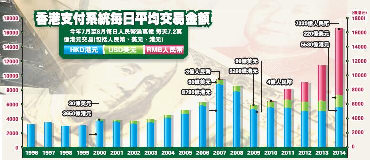 香港人民幣離岸業務發展迅速,人民幣日均成交金額由2007年的3億元增至2014年的7330億元。今年上半年,日均成交則已超過8000億元,7至8月份日均成交量更達到1萬億。陳德霖指,很多實體經濟活動以人民幣結算,人民幣雙邊波動,市場對人民幣對沖的需求或會增加,可能影響資產配置意欲及人民幣交易,但未必影響背後商業活動。以7月份數字來看,暫時看不到人民幣資金池有收縮的壓力。
