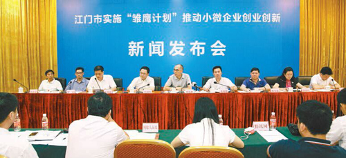 9月14日,江门市委副书记、市长邓伟根携市委常委、常务副市长黄悦胜、副市长吴国杰、各职能局局长及各有关部门负责人等向社会发布并解读实施「雏鹰计划」推动小微企业创业创新一揽子政策措施。