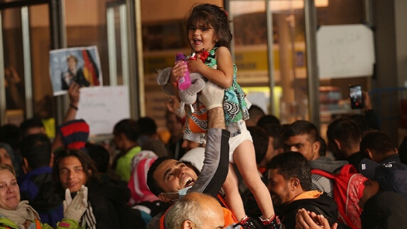 2015年9月5日,德國慕尼黑,一名志愿者舉起一名從匈牙利來的移民。