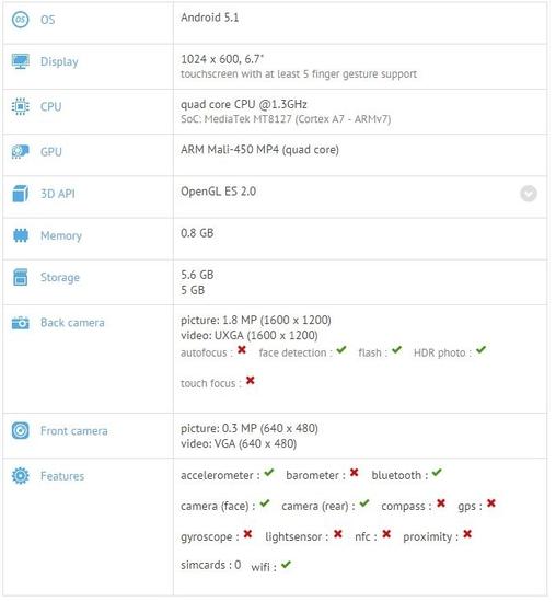 從參數上看,配置已經低得沒話說,1024 x 600顯示屏的配置甚至連中國一些低價智能手機的配置都趕不上,而這還是6.7英寸的平板電腦!0.8GB的內存甚至讓人懷疑這款設備能否流暢地運行;而後置180萬像素、前置30萬像素的攝像頭配置還是幾年前的水平。看起來這款設備唯一的亮點就是價格了。