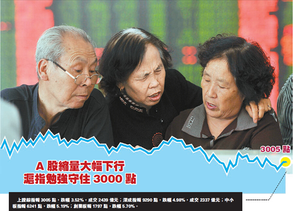 【香港商报网讯】昨天A股低开低走,遭遇空头猛烈反扑。沪指收跌5.23%,勉强守住3000点整数关口,但跌破2850与3011点联机反弹趋势下轨,两市4776亿的成交量更是创下近期新低,继前天千股跌停后,再有近660股跌停。
