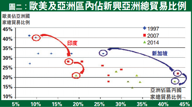 話說回來,雖然坊間常說新興市場經濟如何強勁及如何充當世界經濟火車頭,但要論對全球經濟的影響性,在單是美國及歐盟地區已佔超過全球GDP一半的情況下,要看時下金融或經濟危機會不會於全球大規模爆發,亦要看看新興亞洲與先進歐美的貿易關系。圖二見到,1997年至今,歐美佔新興亞洲貿易的重要性持續降低,而亞洲區內貿易關系卻愈來愈密切。以印度為例,1997年歐美佔印度總貿易約四成,但截至2014年已經下跌至兩成左右,同時其他新興亞洲佔其總貿易額則由低於一成上升至兩成,類似升幅亦見諸在其他亞洲地區上。
