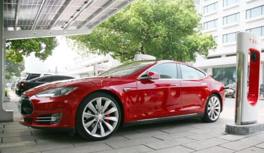 一輛紅色的特斯拉正在快速充電。(資料圖 ) 中新社發 李晨韻 攝