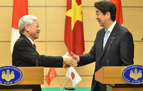 日本首相安倍晋三当晚在东京与来访的越南共产党中央总书记阮富仲举行会谈。双方会后发表共同声明,确认在安保、经贸领域加强合作。
