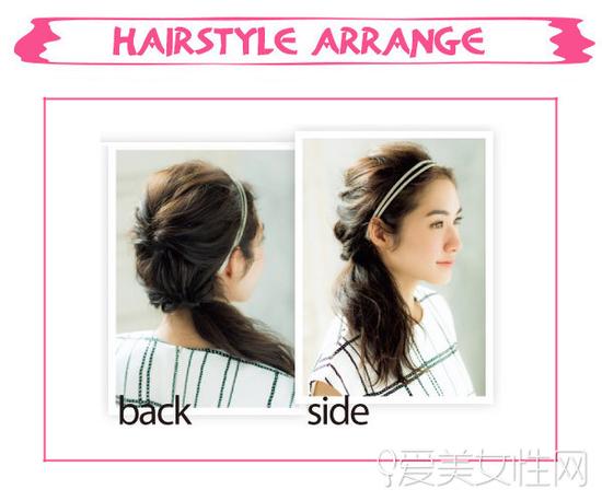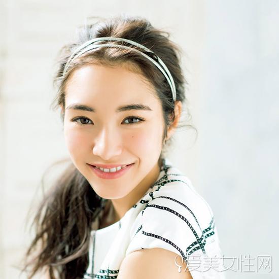 蓬松的长卷发绑成随意的马尾,白色细发箍固定刘海,清爽大气。
