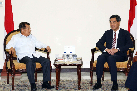 9月16日,香港行政长官梁振英(右)在印尼与印尼副总统尤素夫·卡拉会面时表示,感谢印尼政府同意特区政府于雅加达设立经济贸易办事处(经贸办)。