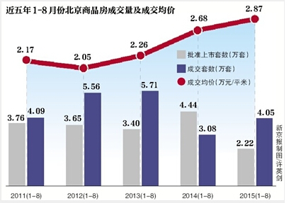 北京市房協的統計數據顯示,今年1至8月,全市新建純商品住宅預售批準上市總量2.22萬套(月均2800套),上市量同比減少50%,是近5年中最少的。然而前8月成交量卻達到4.05萬套(月均5100套),同比增加31%。成交均價更是達到2.87萬元/平米,創近5年同期最高水平。