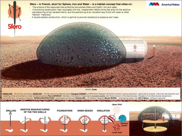 從外形來看像是具備超現代風格的冰屋,Sfero庇護所的部分掩埋在地下,頂部為半圓形穹頂。內部共有三層,最頂部的一層讓人感覺像是在一個夾層中,面積為3平方米,主要用來種植食材等等。第二層共有29平方米,內部包含一個工作區域和浴室。最後一層面積為40平方米,主要作為個人臥室使用。
