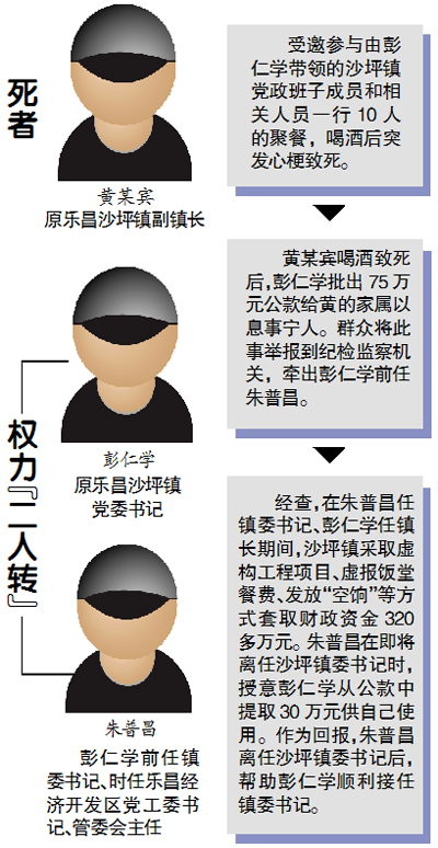 2014年7月底,一封举报信寄到了韶关市纪委,反映乐昌市沙坪镇党委书记彭仁学涉嫌违规使用财政资金、用公款赔偿因应酬致死的副镇长的问题。同年8月1日,彭仁学被韶关市纪委立案调查。孰料,一场饭局引发的调查还牵出了彭仁学的前任朱普昌,在朱普昌任乐昌市沙坪镇镇委书记、彭仁学任镇长期间,采取虚构工程项目、虚报饭堂餐费、发“空饷”等方式套取财政资金320多万元。此外,二人还在工程发包、工程款结算等方面进行权钱交易。最新一期的《广东党风》披露了彭仁学等人违纪违法的事实。