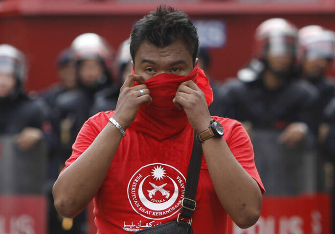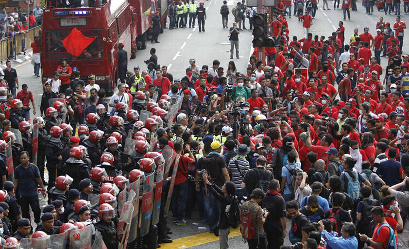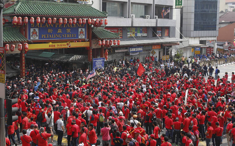 2015年9月16日,马来西亚首都吉隆坡,约三万名马来人身穿红衣在市中心声援受侵吞公款丑闻困扰的总理纳吉布,并谴责华裔政党上月底发动反纳吉布的大型示威。