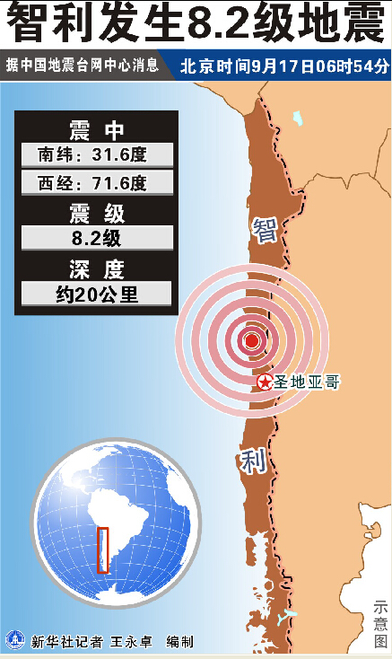 據新華社報道,地震發生在當地時間16日19時54分(北京時間17日6時54分),震中位於科金博大區下卡內拉鎮以西46公里處。據中國地震臺網測定,此次地震為8.2級,震源深度約20公里。由於震源深度較淺,距震中約400公里的首都圣地亞哥震感也十分明顯。