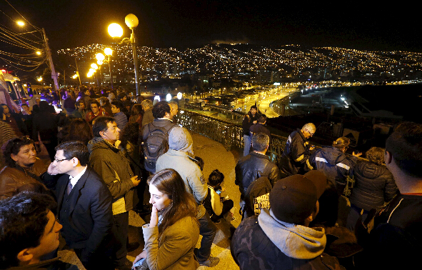 智利中部沿岸近海发生8.2级地震,在智利瓦尔帕莱索,人们地震后在户外避险。路透社