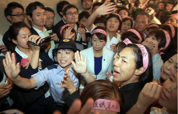 “不要碰我!告你性騷擾啊!”16日晚,在召開特別委理事會的日本國會參院第一理事會會議室前,眾多蜂擁而至的議員混雜在一起,在野黨的女性議員高聲喊叫著,阻攔日本自民黨和平與安全特別委員會委員長鴻池祥肇進入會場。在此起彼伏的怒吼聲中,理事會時斷時續爭執不休。