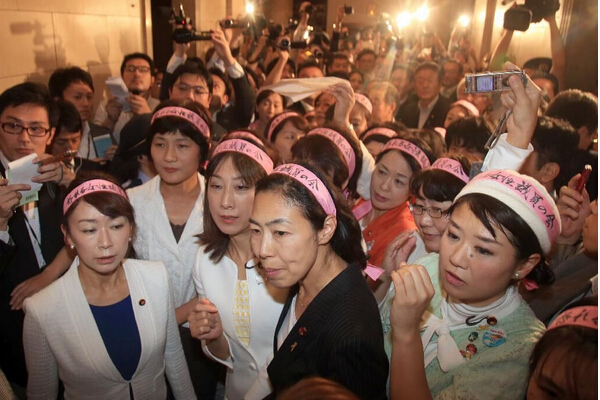 9月16日晚,日本在野黨女議員集體高呼“性騷擾”,試圖阻止自民黨參院和平與安全特委會委員長進入會場。