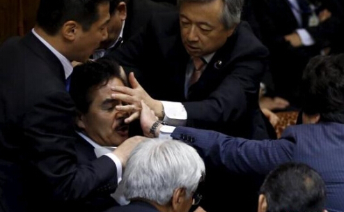 關于正在參議院特別委員會審議的安全保障相關法案(簡稱安保法案),日本執政黨原計劃于16日進行總結性質詢并表決,但由于在野黨議員的激烈反對,現場一片混亂,特別委員會理事會遲遲無法開會,而推遲至17日上午。
