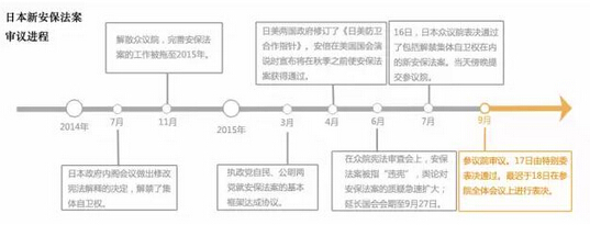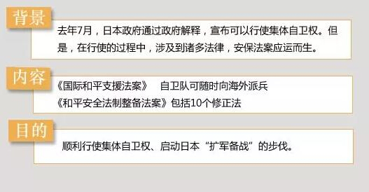由于日本將在本周六進入一個5天的小長假,執政黨為確保安保法案在本屆國會9月27日閉幕前正式成立,力推法案在本周內通過。