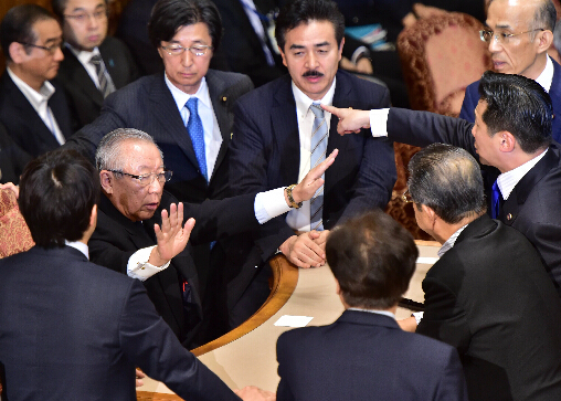 日本参议院17日通过安保法案,参议院特委会委员长鸿池祥肇(举双手者)与在野党议员对峙。法新社
