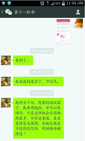 举报帖中附有一名男子与一名女子的合照、短信和微信对话截图以及医院产检B超图片,合照是两人躺在床上自拍的,颇为不雅。在微信截图中,一名女子给微信ID为“萧十一郎”的人发送了一张图片,“萧十一郎”随后用粤语回复表示,如果该女子想留下孩子,他也可以养得起。在短信对话中,两人也是表达了相似的意思。