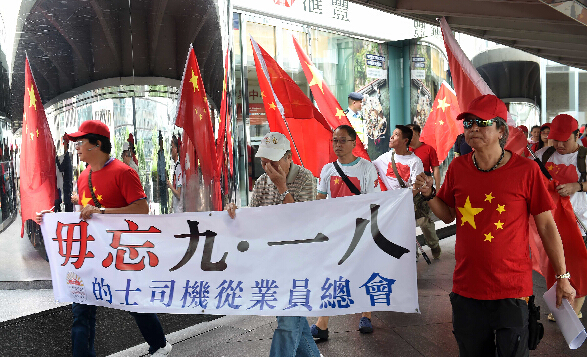当日清晨,本地爱国组织“一群中华儿女”聚集在位於中环的和平纪念碑下,纪念“九一八”事变84周年。他们身穿印有五星红旗的衬衫,手举写有“勿忘日本侵华血泪史”、“打倒日本军国主义”及“撤回侵略性新安保法案” 等字样的条幅,还有数人手举五星红旗及香港特区紫荆花区旗。