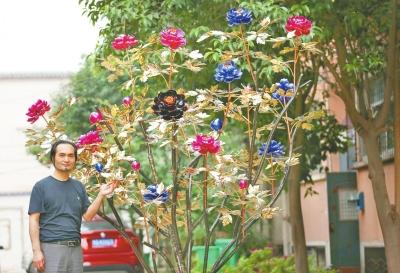本报讯绢丝做成的仿真牡丹、泥土烧制成的牡丹瓷、笔墨绘成的牡丹画,这些各式各样的“牡丹”,大家早已非常熟悉。近日,洛阳的金属锻造大师王书品用钢管、铝板、不锈钢板等捶锻出一棵“金属牡丹树”,高达3米,创意别出心裁。