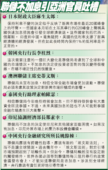 瑞銀新興市場首席投資官馬里斯卡爾說:「問題在於聯儲局引入了更大的指標,那就是關注全球性經濟問題。市場可能會說,聯儲局究竟知道哪些我們所不知道的?」就在聯儲局宣布按兵不動之后,原本市場預期應當上漲的標普500指數反而走低了,周四收市下挫0.26%。