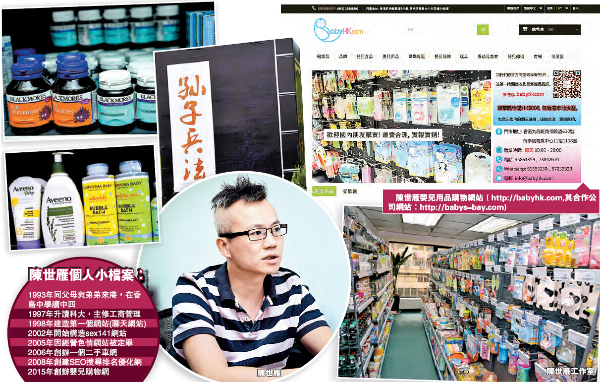 對於陳世雁新開的嬰兒用品購物網站也是應用了化繁為簡的理念,首先他運用了最為常規的網頁模板,首頁為一些新到產品及受歡迎產品的圖片與價格。雖然產品眾多,但分類較為詳細,而且還有公司的聯絡電話與地址。整體而言,一目了然。(編按:惟獨在設計與美術方面,略為簡單。)