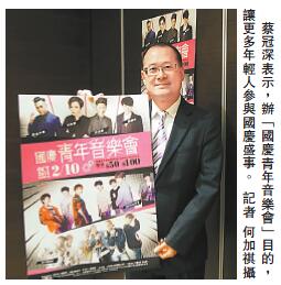 【香港商報网訊】記者何加祺報道:為慶祝國慶66周年紀念,香港同胞慶祝中華人民共和國成立66周年籌備委員會今年首次舉辦「國慶青年音樂會」,邀請了來自香港、內地、韓國及新加坡等地的歌手參與活動。籌備委員秘書長、香港新華集團主席蔡冠深表示,過往的國慶晚會活動都很少年輕人參加,為了讓更多年輕人參與國慶活動,特意舉辦一場年輕音樂會,讓大家好好享受國慶假期。