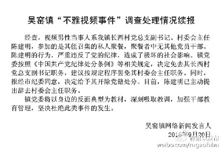 江蘇如皋市所屬長西村副書記、村委會主任陳某的一段不雅視頻被曝光,視頻中,該村官跟一名長發女子摟抱在一起并試圖脫該女性衣服,陳某手上金表、金戒指等光亮閃閃,而被其脫衣撫摸的長發女子胸部、肚部等已裸,三段視頻語音顯示,視頻并不是偷拍,而是故意配合拍攝。對此,吳窯鎮新聞發言人就“不雅視頻事件”調查處理情況進行了續報,確認該名村官為吳窯鎮長西村黨總支副書記、村委會主任陳建明,參加的聚會系其侄子召集的私人聚會,無其他黨員干部。根據《中國共產黨紀律處分條例》等相關規定,決定免去陳建明長西村黨支部副書記職務,建議免去其村委會主任職務,同時報經市委同意,決定開除其黨籍。