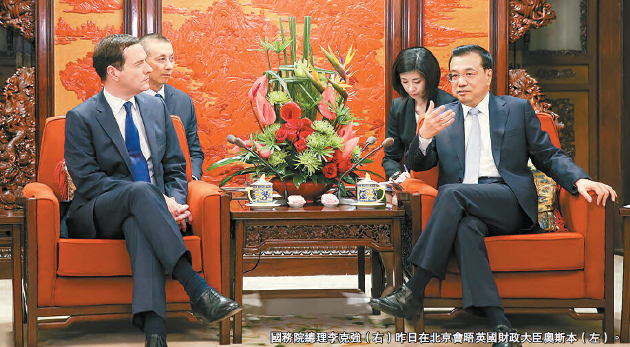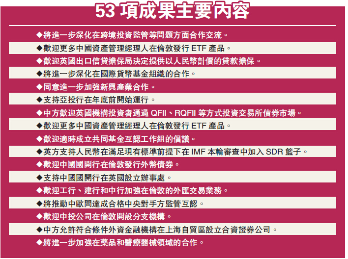 奧斯本昨天透露,對於中國承諾放寬合格境外機構投資者對非主權投資的配額限制,英國表示歡迎。中國央行短期內將在倫敦發行人民幣計價的央行票券。雙方決定推進兩國及全球經濟的強勁、平穩及可持續發展。并采取與本國及海外經濟財政情況相符的適當政策措施。