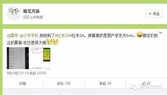 網友@蠟筆艿新 表示,自己買到的是紅米2A的增強版,收到手機自測後屏幕竟然是國產京東方boe,這與小米官方標注的“夏普/友達等”相差很大。