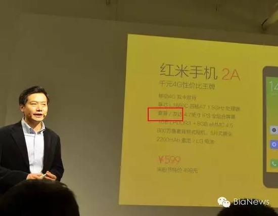 雷軍在紅米2A(不是增強版)發布會當天,PPT上清楚地標著“夏普/友達4.7英寸”,沒有“等”字。