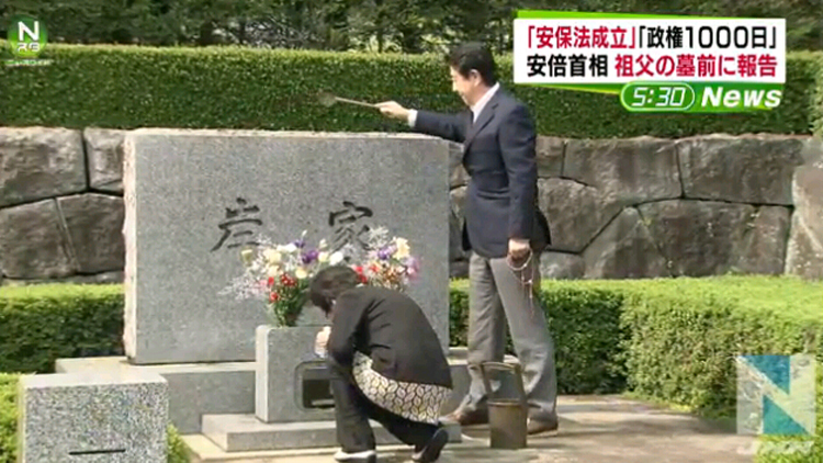 原標題:日本首相安倍晉三到外祖父墳前報告安保法案通過(組圖)
