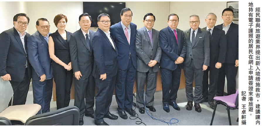 經民聯昨日聯同一眾旅游業界代表召開記者會。副主席林健鋒表示,8月份本港的訪港旅客較去年同期下降6.6%,雖然與7月份的跌幅8.4%相比,有所放緩,但依然顯著。他認為旅游業不能守株待兔,而應主動開拓更多內地客源。他指,內地現時有2千萬人擁有電子護照,而且未來5年內地當局會向市民簽發更多電子護照,這批人士有較高的消費力,屬於優質客源,若開放網上簽證,讓他們到香港旅游,能解決本港旅游業寒冬問題。