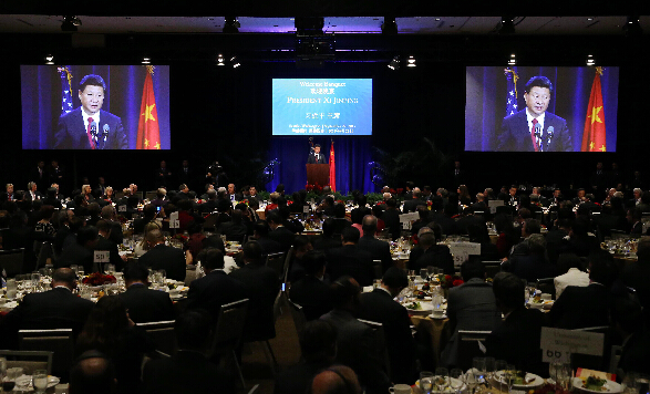 9月22日,國家主席習近平在美國華盛頓州西雅圖市出席華盛頓州當地政府和美國友好團體聯合舉行的歡迎宴會并發表演講。