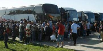 當地時間2015年9月17日,克羅地亞Tovarnik,抵達當地的移民等待登上公共汽車或火車。移民蜂擁乘車秩序混亂,發生踩踏造成了人員受傷。