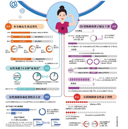 此外,目前中國男女兩性家務勞動時間差距由10年前的150分鐘縮短到74分鐘,70%以上的婦女參與家庭重大事務決策。