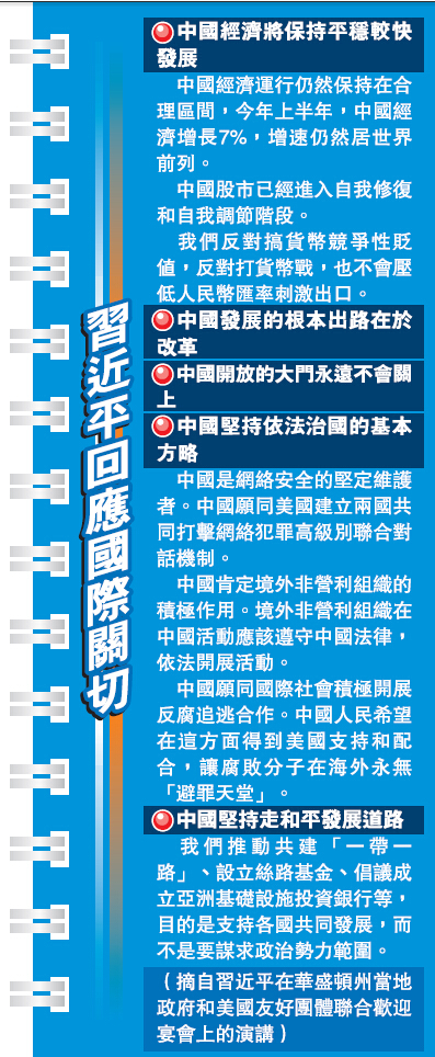 繼此訪前接受《華爾街日報》書面採訪,習近平再次談到中國股市。他說,前段時間,中國股市出現了異常波動,引起大家關注。股市漲跌有其自身的運行規律。政府的職責是維護公開、公平、公正的市場秩序,防止發生大面積恐慌。這次,中國政府採取了一些穩定市場的措施,遏制了股市的恐慌情緒,避免了一次系統性風險。各國成熟市場也採取過類似做法。中國股市已經進入自我修復和自我調節階段。