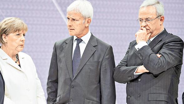 默克爾(左)昨日向福士施壓。有傳由保時捷行政總裁米勒(中)取代溫特科恩(右)成為福士總裁。 法新社