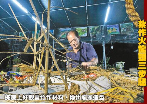 重操睽違40多年的「舊業」,黃師傅笑說紮起火龍一點都不陌生,更令他回想起童年的時光。他告訴記者如何由零開始紮火龍。首先要挑選上好的觀音竹製作龍頭,因觀音竹節點不多,而且質地較軟,容易拗出造型。萬事開頭難,黃師傅說削竹的時間比紮龍頭更長,一個龍頭需要耗掉兩支30呎長的竹,然後要削成足夠勻稱及扁平的竹片。用竹片拗出龍頭的輪廓,加上鐵線做龍鼻,電筒做龍眼,前後至少花費半天。